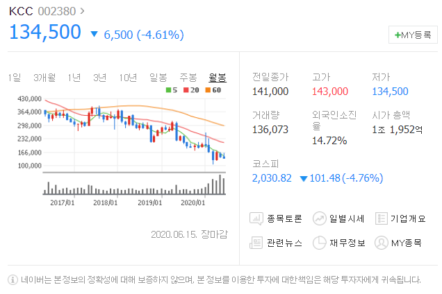6월 12일보다 6500원 하락했으며, 6월 15일 134500원으로 마무리 되었네요.